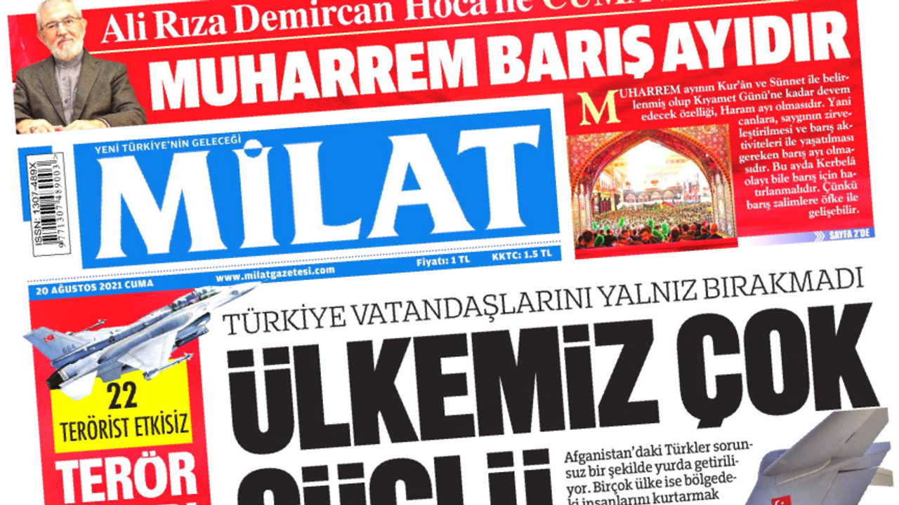 Milat Gazetesi'nin bugünkü manşetinde Türk vatandaşlarının Afganistan'dan tahliyesi var.
