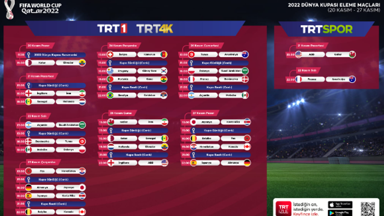 20 Kasım Pazar (yarın) günü başlayacak 2022 FIFA Dünya Kupası maçları TRT’den canlı yayınla ekranlara gelecek. Futbolun bir numaralı organizasyonu, Türkiye sınırları içinde TRT 1, TRT Spor ve TRT 4K kanalı ile TRT İzle dijital platformundan takip edilebilecek.