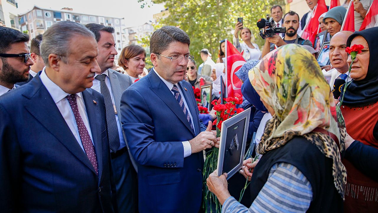 Adalet Bakanı Yılmaz Tunç ve eşi, Diyarbakır anneleri tarafından Türk bayrakları ve çocuklarının fotoğraflarıyla karşılandı. Tunç çifti, ailelerle tek tek görüşerek gül verdi.