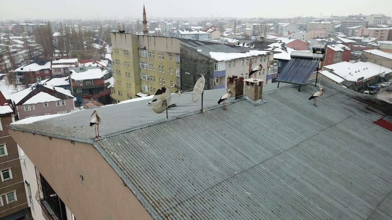 8 leylekten oluşan sürü, Eski Van Caddesi'nde bulunan yüksek katlı bir binanın çatısına kondu. Leylekler, dronla görüntülendi.