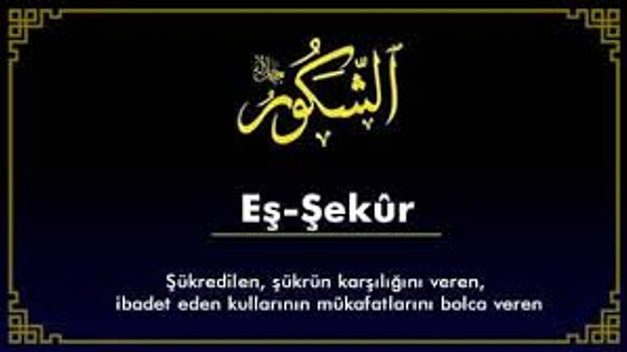 Eş-Şekûr :Az iyiliğe çok mükafat veren. Rızası için yapılan iyilikleri fazlası ve pek ziyadesi ile karşılık veren manasındadır.