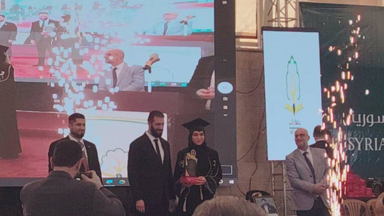Düzenlenen mezuniyet töreninde konuşan Latife el Durubi, eğitim hayatında kendisine destek olan Cumhurbaşkanı Ahmed Şara'ya teşekkür etti.