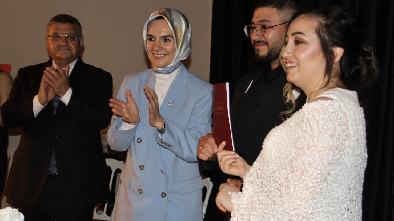 Bakan Göktaş, konuşmasının ardından genç çifte evlilik cüzdanlarını verdi, hediye takdim etti.