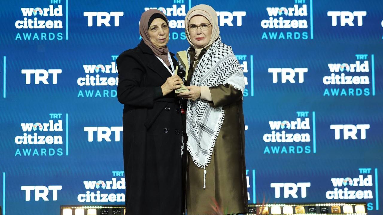 Geceye katılan Yahya Barzak’ın annesi Yousra Barzak’a ‘Yılın Dünya Vatandaşı Ödülü’ takdim edildi. Anne Barzak ödülü, Emine Erdoğan’dan aldı. O anlarda Erdoğan ve Yousra Barzak birbirlerine sarıldı. Barzak, boynundaki kefiyeyi çıkarıp Emine Erdoğan’ın omzuna sardı. Sahnede ve salonda duygu dolu anlar yaşandı.
