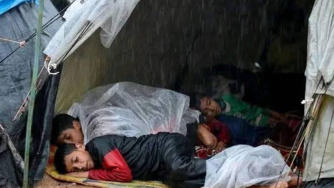 Çoluk çocuk binlerce Filistinli, gidecek yerleri olmadığı için yağmur sularıyla dolan çadırlarda yaşamak zorunda kaldı.