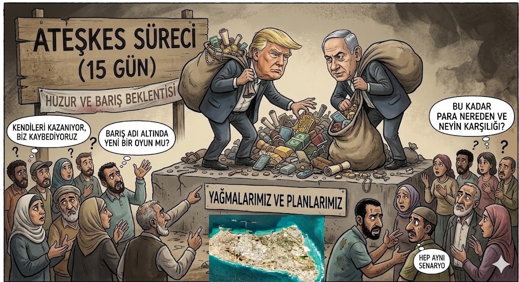 Adamlar masanın altında el sıkışmış. 15 gün ateşkes... Neden? Çünkü mühimmat bitti, para lazım, biraz da çalınacak ganimetlerin sayılması gerekiyor. 15 gün sonra tekrar "Allahu Ekber" ve "Mazel Tov" diye bağırıp birbirlerine boş kovan fırlatmaya devam edecekler ki, halk "bak savaşıyoruz" desin, paralar da akmaya devam etsin.