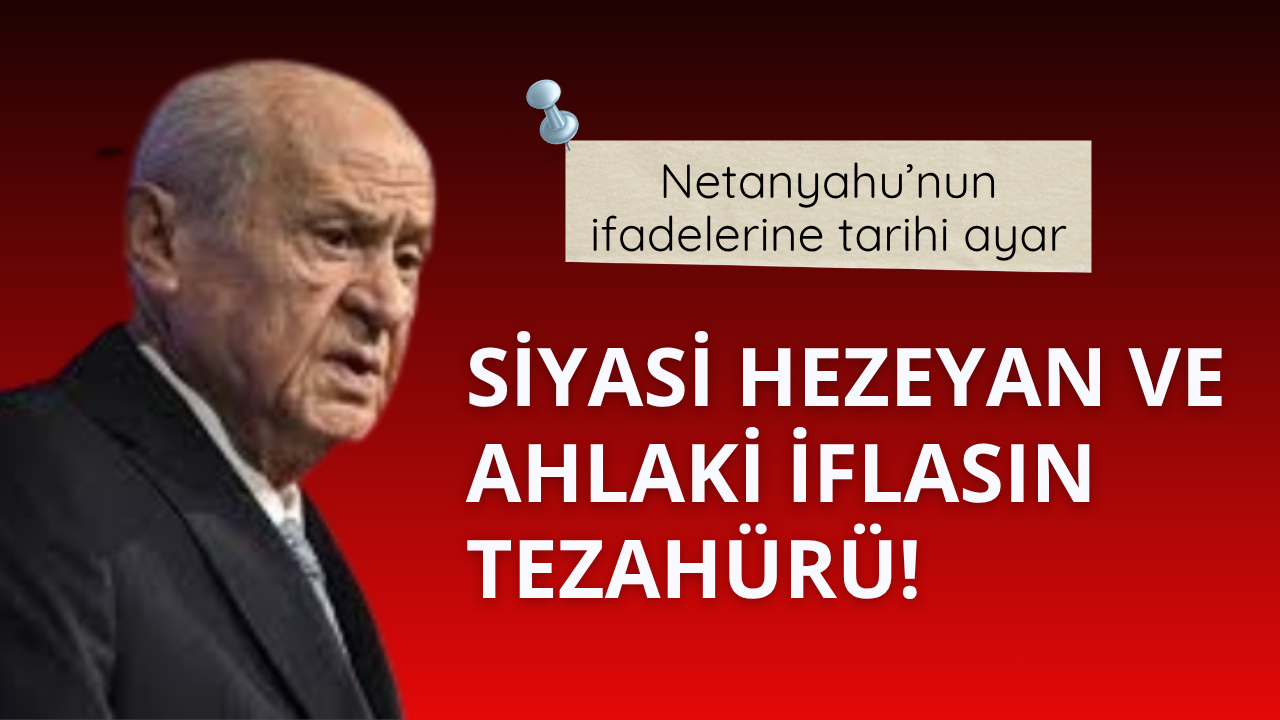 "İsrail'in suç kaydı kabarık, temel insan hak ve özgürlüklerinden bihaber ve demokrasinin düşmanı olan başbakanı Netanyahu'nun Türkiye Cumhuriyeti Cumhurbaşkanı Sayın Recep Tayyip Erdoğan hakkında sarf ettiği seviyesiz ve küstah ifadeler, yalnızca bir siyasi hezeyanın değil, aynı zamanda ahlaki iflasın da tezahürüdür." değerlendirmesini yapan Bahçeli, şöyle devam etti: