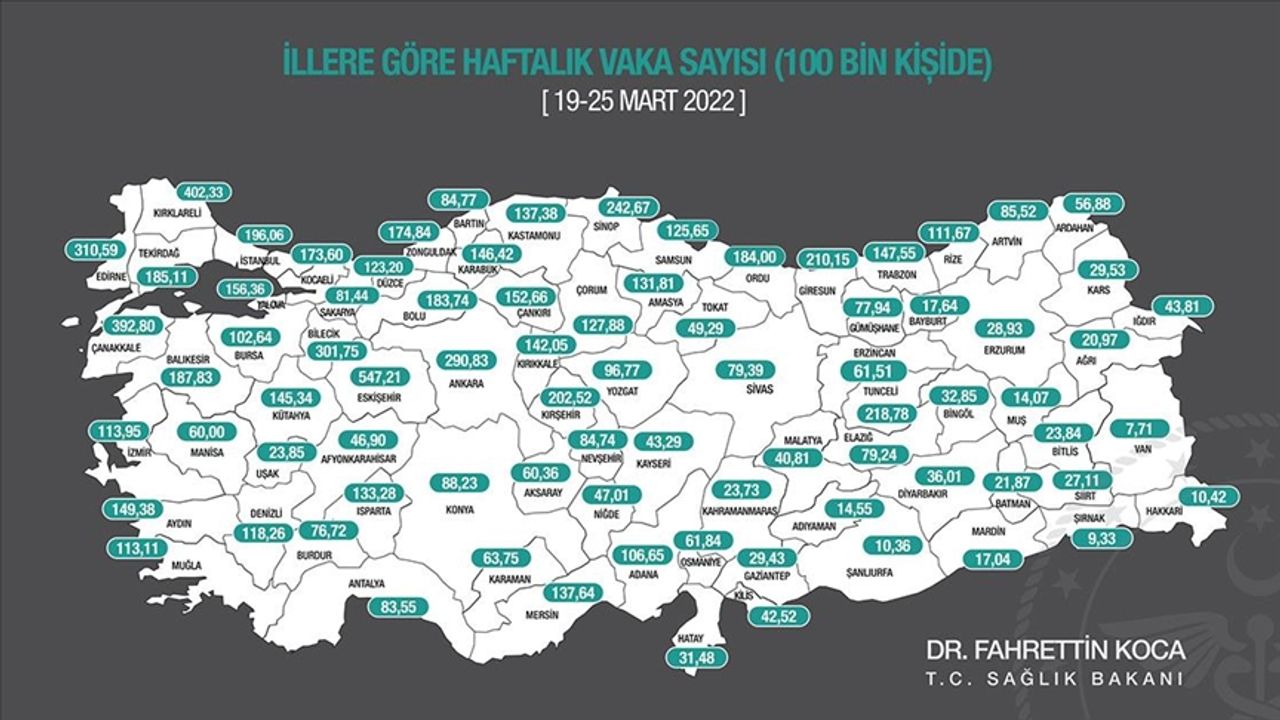 Sağlık Bakanı Fahrettin Koca, sosyal medya hesabından, 19-25 Mart'ta il bazında her 100 bin nüfusa karşılık gelen Kovid-19 vaka sayılarının yer aldığı haritayı paylaştı.