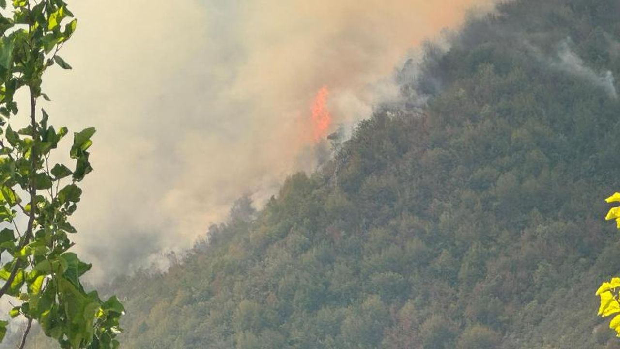 Alevler ve duman geniş alanda etkili olurken, yangının söndürülmesi için havadan ve karadan çalışma yürütüldü.