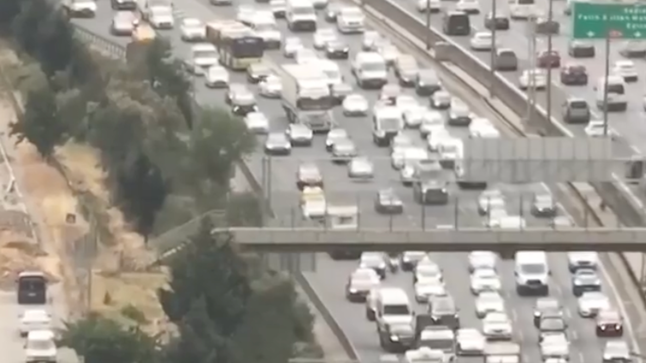 İki şeritli yolun yer yer iki şeridinin de araçlarla kaplandığı görülüyor.