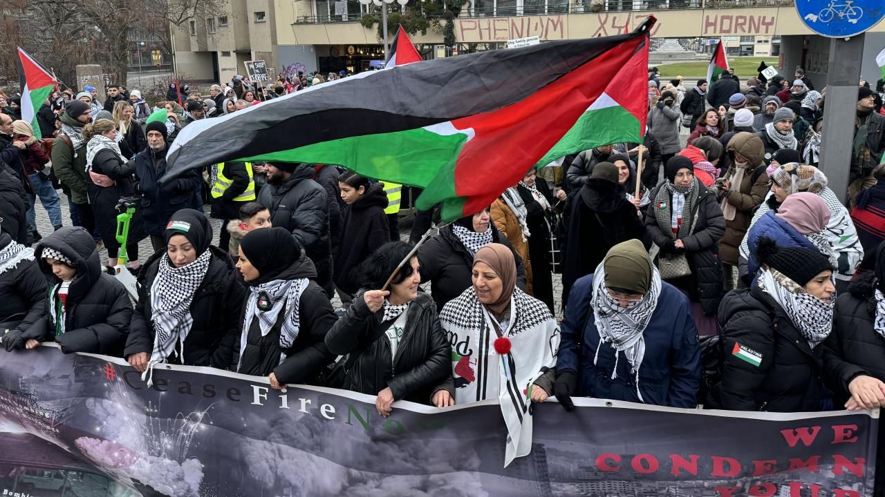 Göstericiler, Filistin bayrakları ile "Masum insanları öldürmeyi durdurun", "Başbakan Scholz, Dışişleri Bakanı Baerbock ne zaman kana doyacaksınız?", "Alman politikacılar Filistin'e sessiz, sağır ve kör", "Gazze'de işgale son verin" ve "Çocukların toplu mezarları üzerine kutsal topraklar inşa edemezsiniz" yazılı döviz ve pankartlar taşıdı.