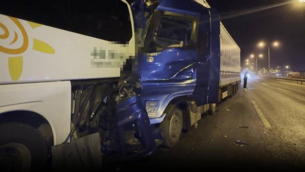 Bilecik'in Bozüyük ilçesinde Bozüyük-Eskişehir karayolu Dodurga Kavşağı'nda kapısı kapanmadığı için emniyet şeridinde duran tur otobüsüne arkadan gelen tır çarptı.