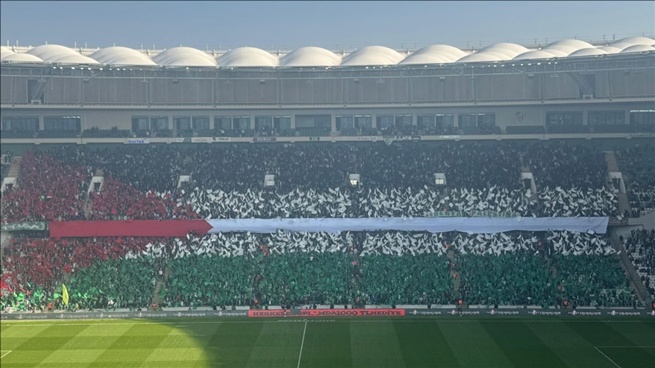 Bursaspor, maçtan 4-1 galip ayrılırken taraftarlar takımlarına desteğin yanı sıra soykırıma sessiz kalmayarak tribünlerde katil İsrail'i protesto etti.