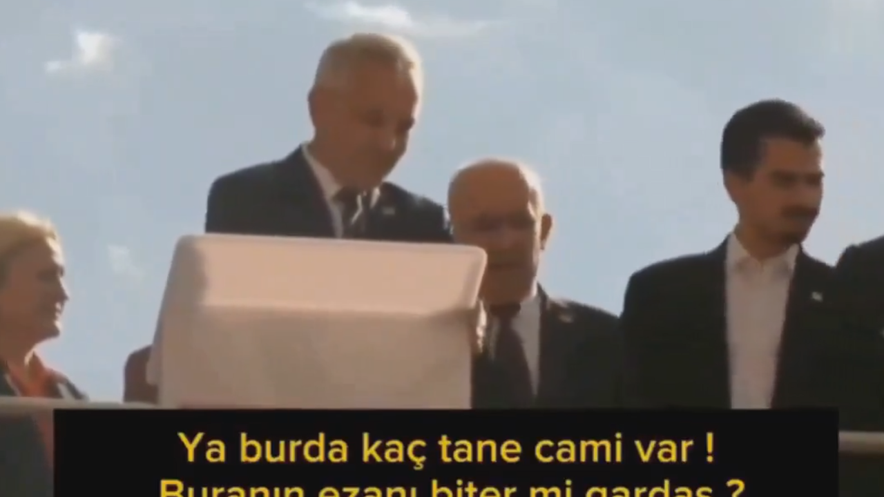 O sırada konuşmasını yarıda kesen Veli Gündüz Şahin'in etrafındaki bir şahıs, "Burada kaç tane cami var buranın ezanı biter mi? Bu ne ya ora cami ora cami" dedi.
