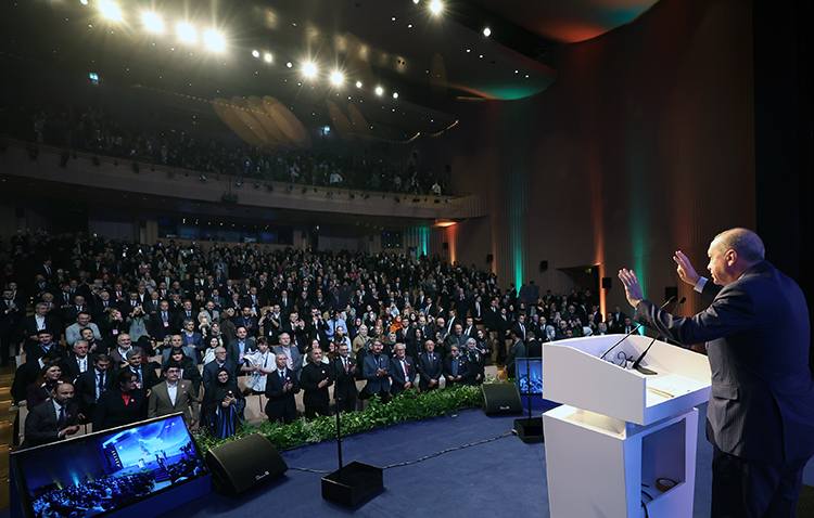 “Filistin halkına buradan dayanışma duygularımı iletiyorum.” diyen Cumhurbaşkanı Erdoğan “Netanyahu Firavunu” deyince salondan büyük bir alkış koptu. Gazze’deki İsrail saldırılarında şehit edilen 71 binden fazla Filistinliye Allah’tan rahmet dileyen Erdoğan, sözlerine şöyle devam etti: “O çadırların içerisinde kışta, yağmurda, çamurda 7’den 70’e o çocukların, annelerin hâlini ekranlarda izliyoruz değil mi? ‘Konteyner gönderelim.’ diyoruz. Birleşmiş Milletler’i devreye sokuyoruz, Batı’yı devreye sokuyoruz. (İsrail Başbakanı Binyamin) Netanyahu denilen firavun zaten bu işlere asla ilgi duymaz ve bunu kabul etmiyor. Ayet-i Kerime’de Rabb’imiz buyuruyor: ‘Hesapların üzerinde bir hesap var.’ Bunun da vakti, saati inşallah gelecek.”