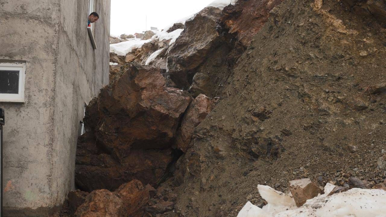 Karşıyaka Mahallesi'nde, yamaçtan kopan büyük bir kaya parçası Yusuf Dayan'a ait 4 katlı binanın giriş katında bulunan dairedeki odanın duvarına çarptı.