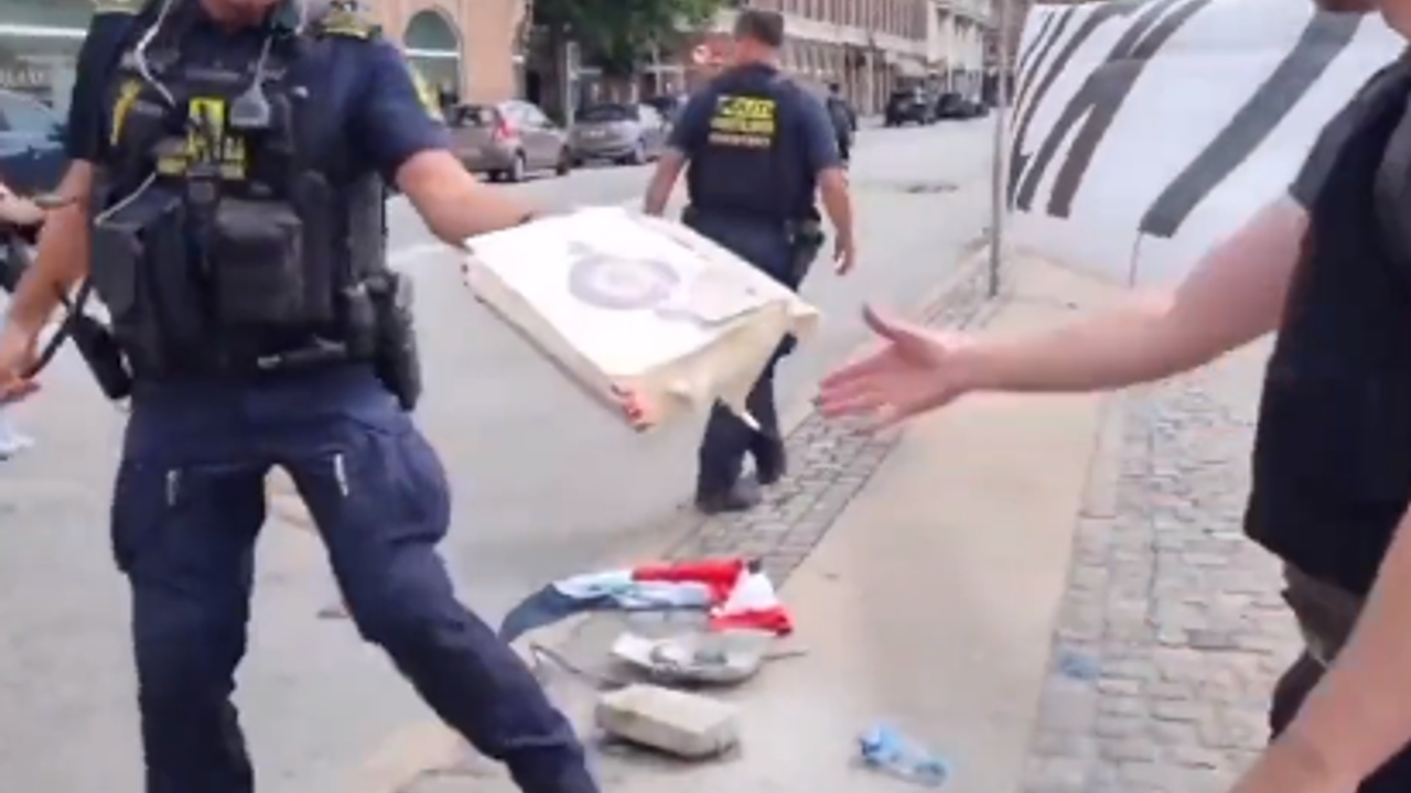 Kur'an-ı Kerim'in yakılmasını engellemeye çalışan kadın Danimarka polisiyle karşı karşıya geldi. Polis, kadına müdahale ederek, Kur'an-ı Kerim'i saldırı düzenleyen kişiye yakması için geri verdi.