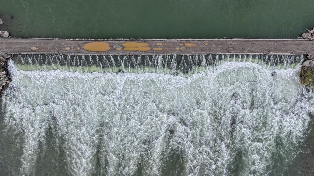 Dronla kaydedilen görüntülerde, debisi artan Dicle Nehri, su altında kalan tarım arazileri ve yol yer alıyor.