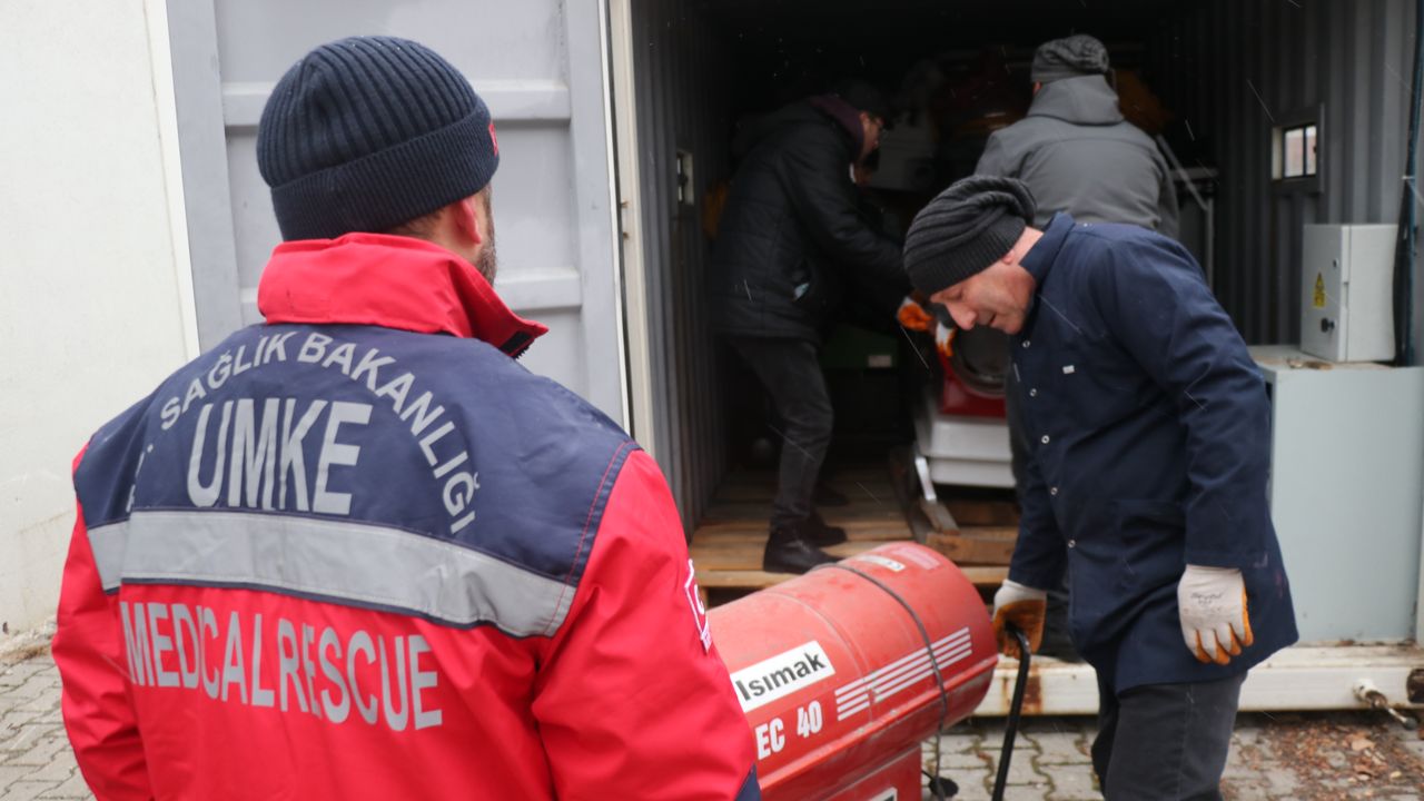 Çalışmalara katılacak UMKE ve sağlık personelinin konaklama çadırları ve ısıtma sistemleri yüklü 2 konteyner de bölgeye gönderildi.