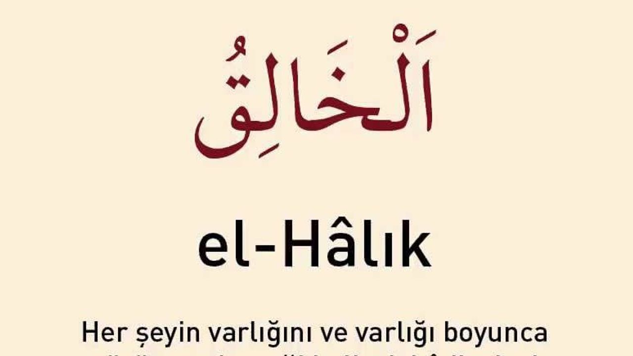 EL -HALIK: Her şeyi yoktan var eden, yaratan. Herşeyin varlığını ve yaşadığı sürece geçireceği halleri,olayları önceden tesbit edip ona göre ortaya çıkaran, meydana getiren (Halk eden).