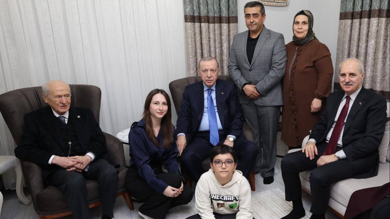 Erdoğan'a ziyaretinde, TBMM Başkanı Numan Kurtulmuş, MHP Genel Başkanı Devlet Bahçeli, Çevre, Şehircilik ve İklim Değişikliği Bakanı Murat Kurum, Aile ve Sosyal Hizmetler Bakanı Mahinur Özdemir Göktaş, Tarım ve Orm
