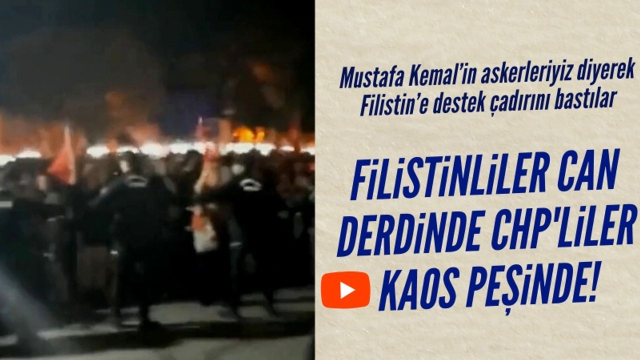 Türkiye Cumhuriyeti'nin 100.yılı için kutlamalarını bahane ederek meydanları dolduran CHP'li bir grup, Filistin halkına destek için açılan bir çadıra saldırdı.