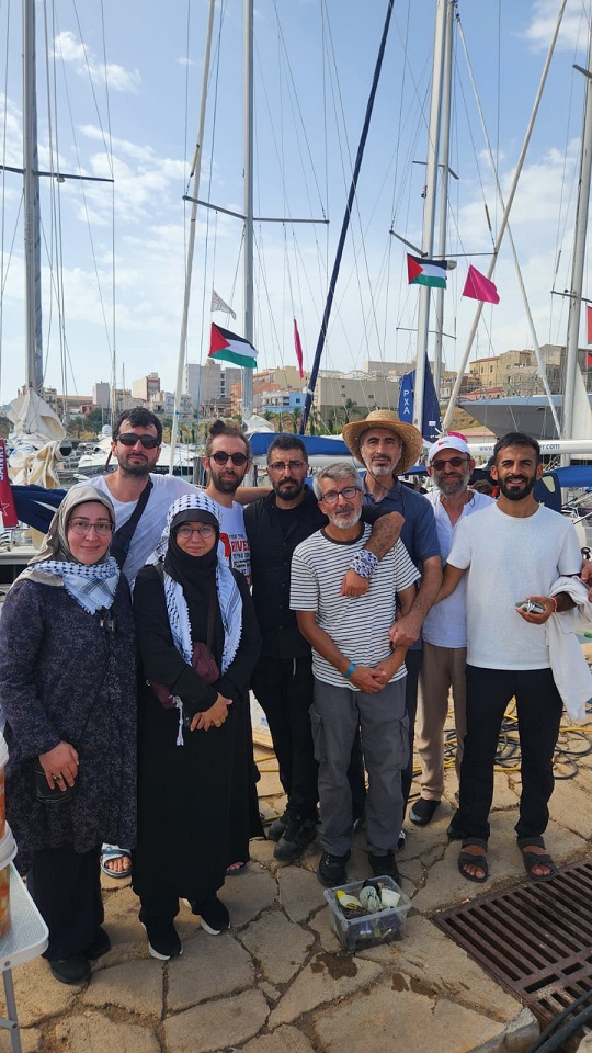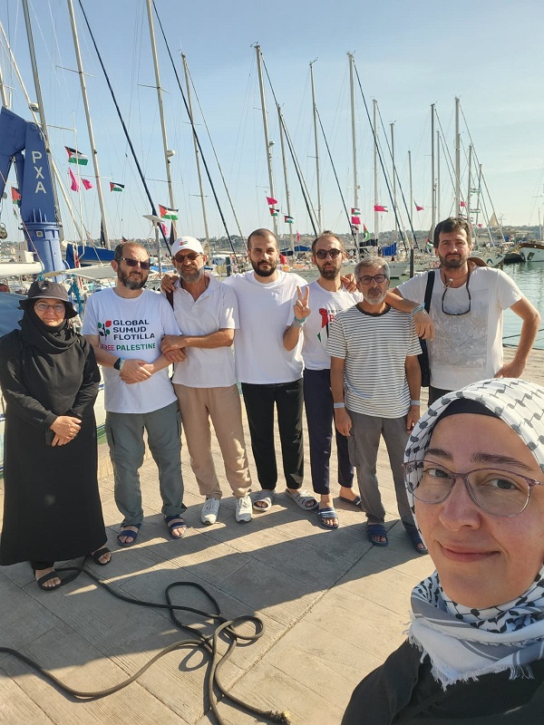 Teknede farklı kültürlerden ve farklı statülerden insanlar var. Teknemizin adı Morgana. 10 kişiyiz toplam. Av. Gülden Sönmez, ben, Kaptan Ceasere, Kaptan Yardımcısı Carlos, Global Sumud hareketinin İtalya’daki sözcüsü Maria Elena Delia, İtalyan senatör Marco Croatti, Yeşil-Sol İttifak’ın Avrupa Parlamenteri Benedetta Scuderi, Sivil toplum kuruluşu Music for Peace ‘in Başkanı Stefano Rebora, İtalyan gazeteci Barbara ve hemşire Vito.Kültürümüz ve dünya görüşlerimiz farklı olmasına rağmen aynı hedefe doğru uyum içinde bir yolculuk yapıyoruz.