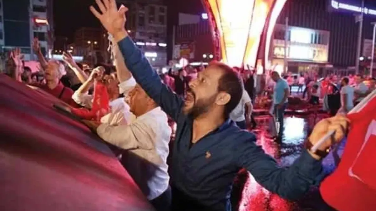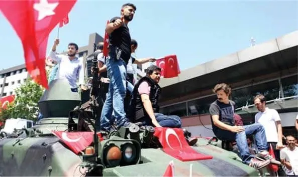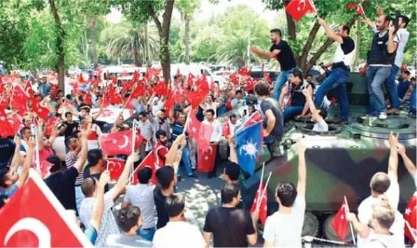 Mersin'de, vatandaşlar ellerinde bayraklarla zırhlı araçların üzerine çıkarak darbe girişimini protesto ettiler.