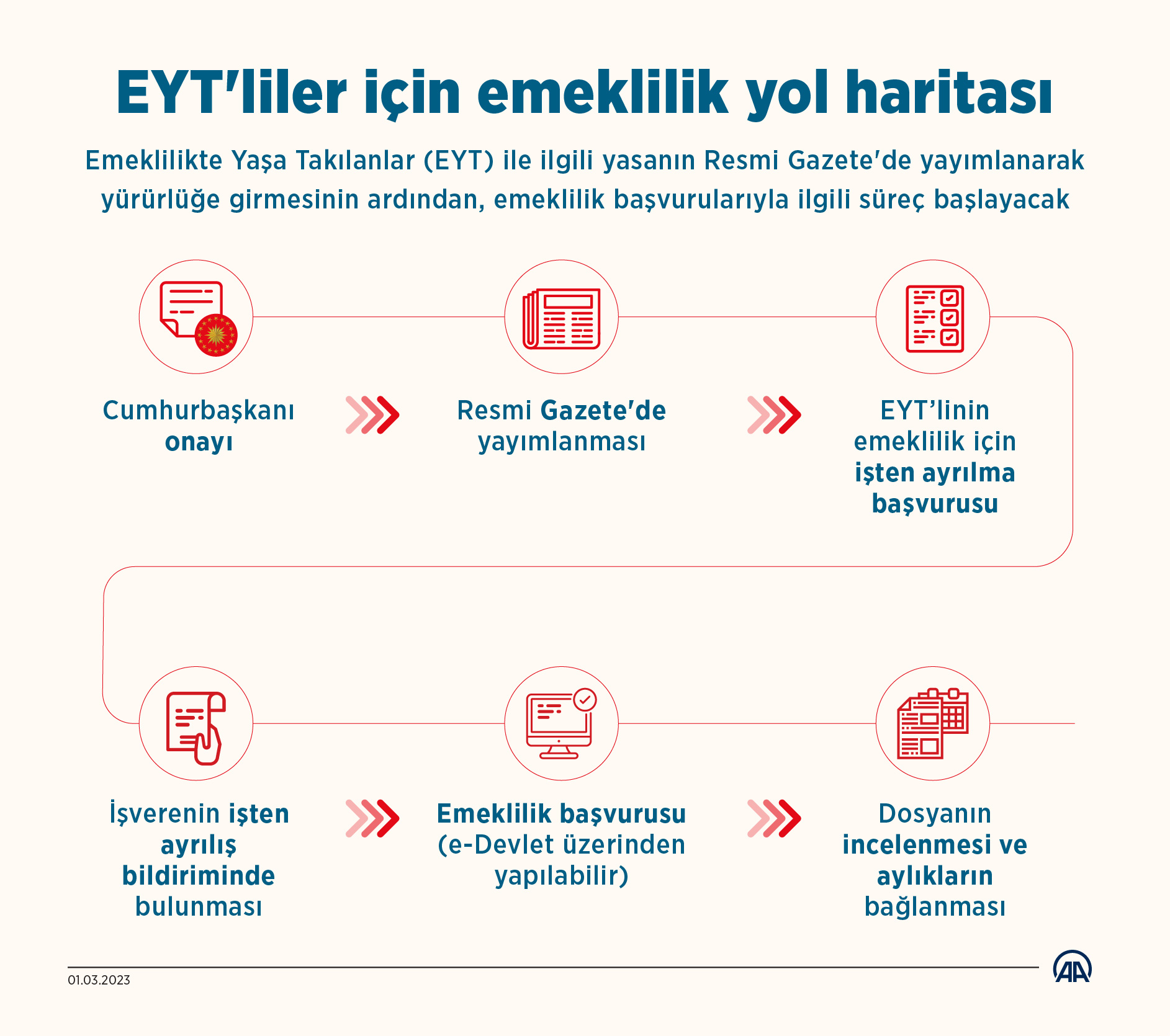 Başvuruya hangi adımla başlanmalı?Yasadaki şartları karşılayanlardan, sigorta kolu 4/a (SSK) olanlar emeklilik için ilk olarak mevcut iş yerlerine "emeklilik" gerekçesiyle işten ayrılma başvurusu yapacak. İşverenin işten ayrılış bildiriminin ardından, EYT'liler e-Devlet üzerinden emeklilik için kolayca başvurabilecek.Son olarak başvurular dosya bazlı incelenecek ve emekli aylığı bağlanıp bağlanmaması yönünde karar verilecek. Şartları karşılayıp emekliliğe hak kazananlara aylıkları en kısa sürede bağlanacak.