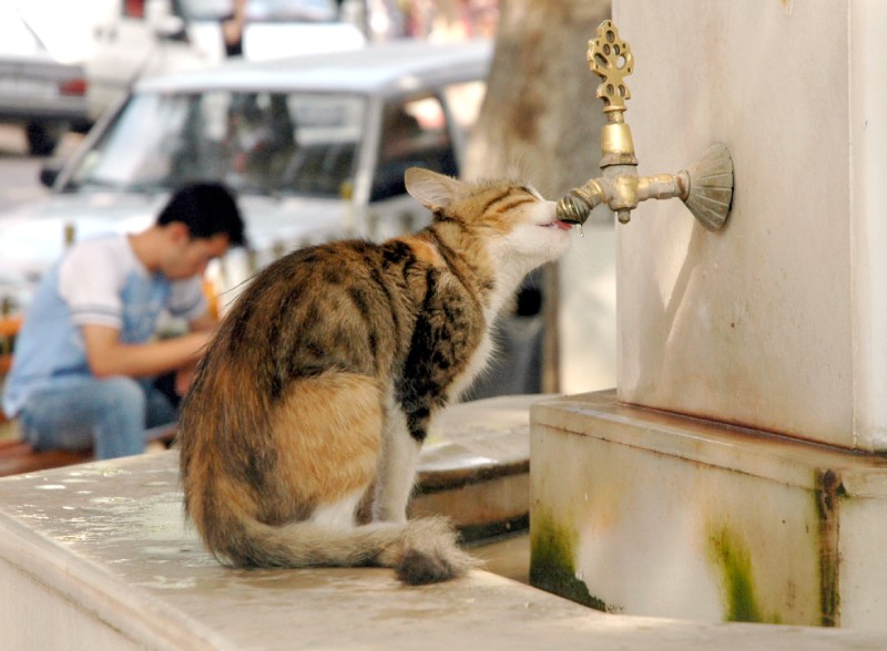 . Bilecik'te 5 Eylül 2007'de bölge esnafının beslediği kedi, susuzluğunu şadırvan musluklarından damlayan sularla gideriyor. (Arşiv)
