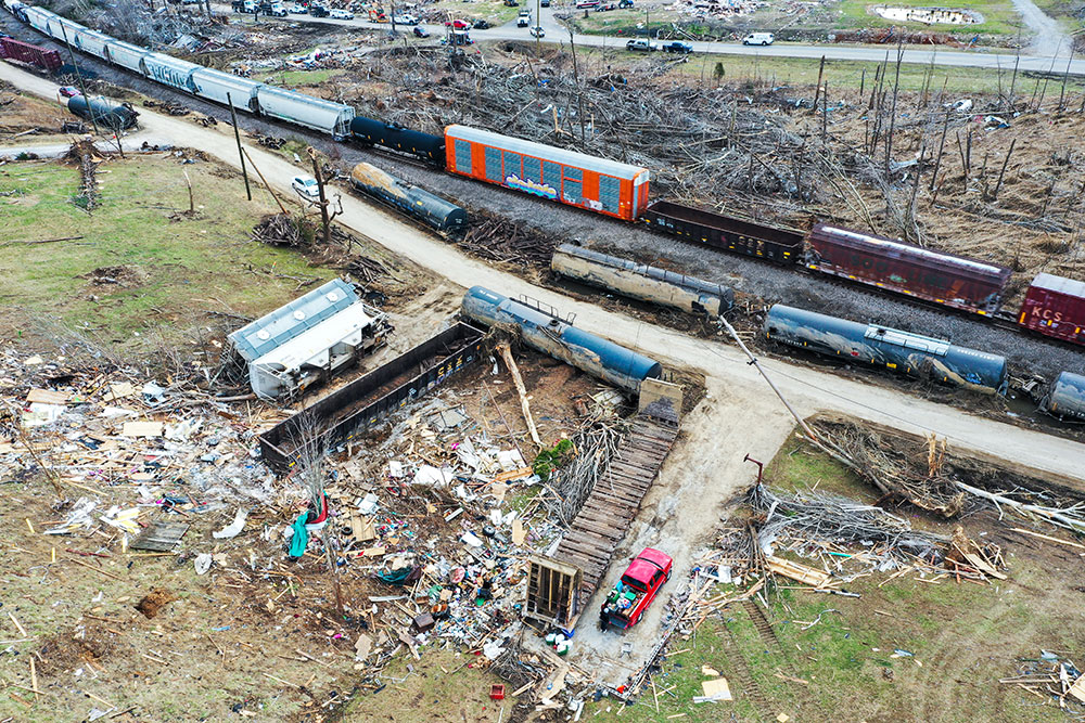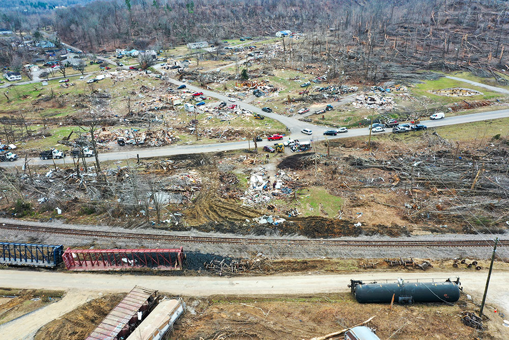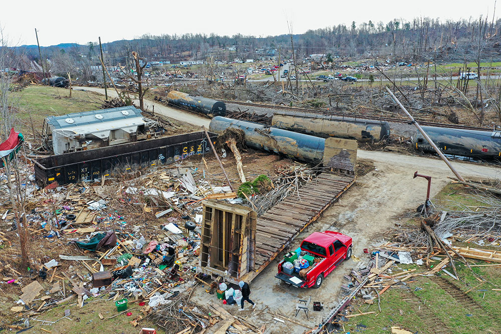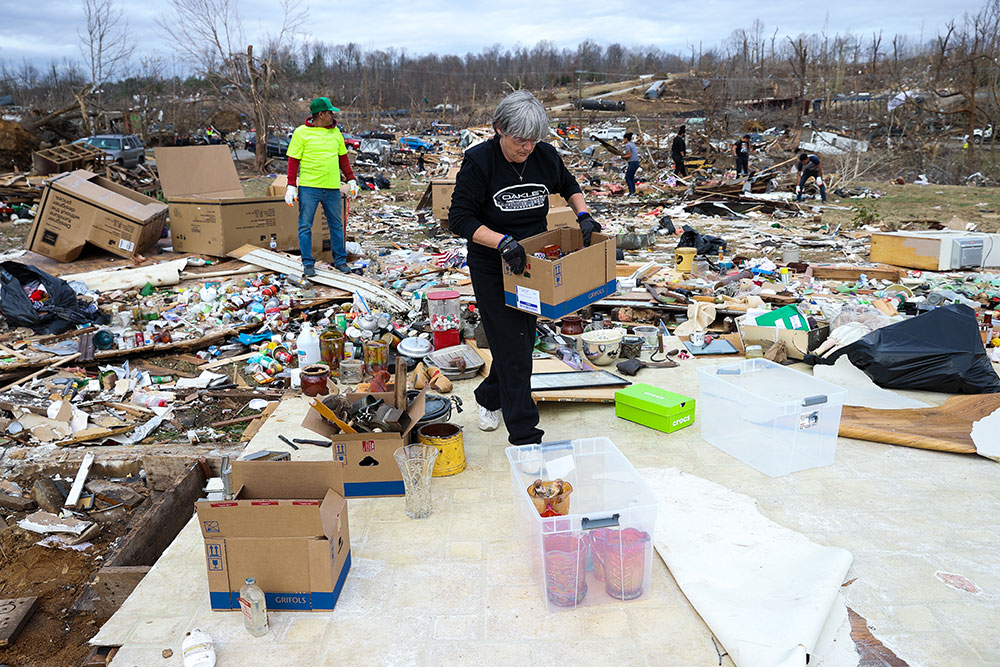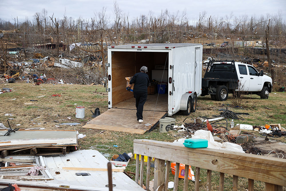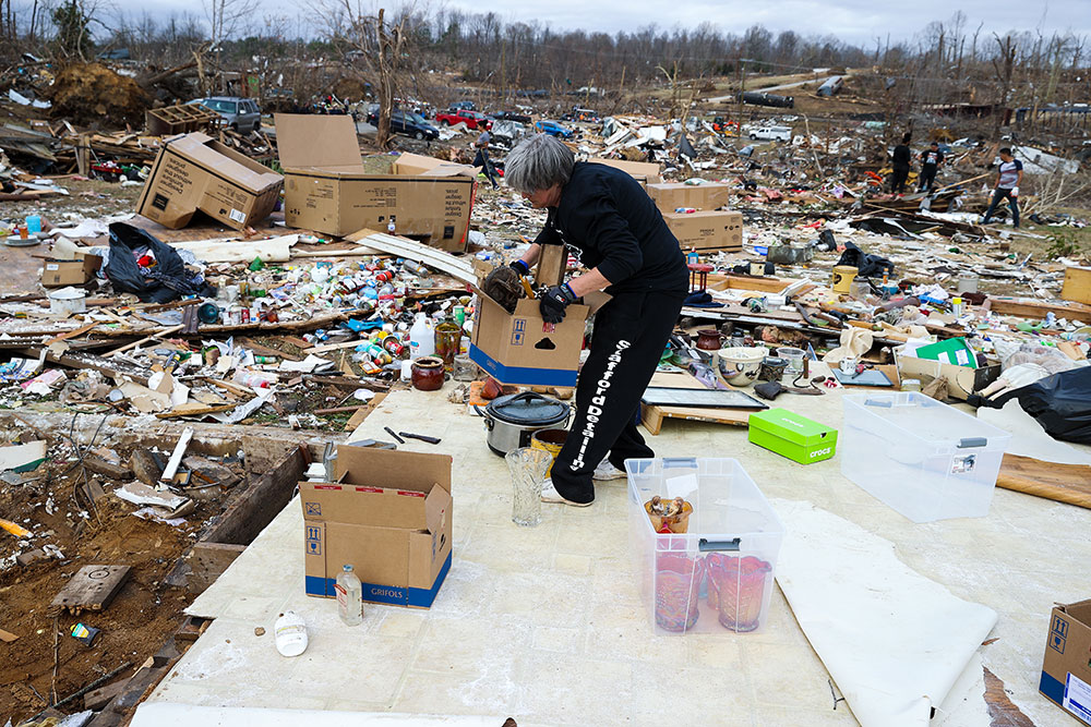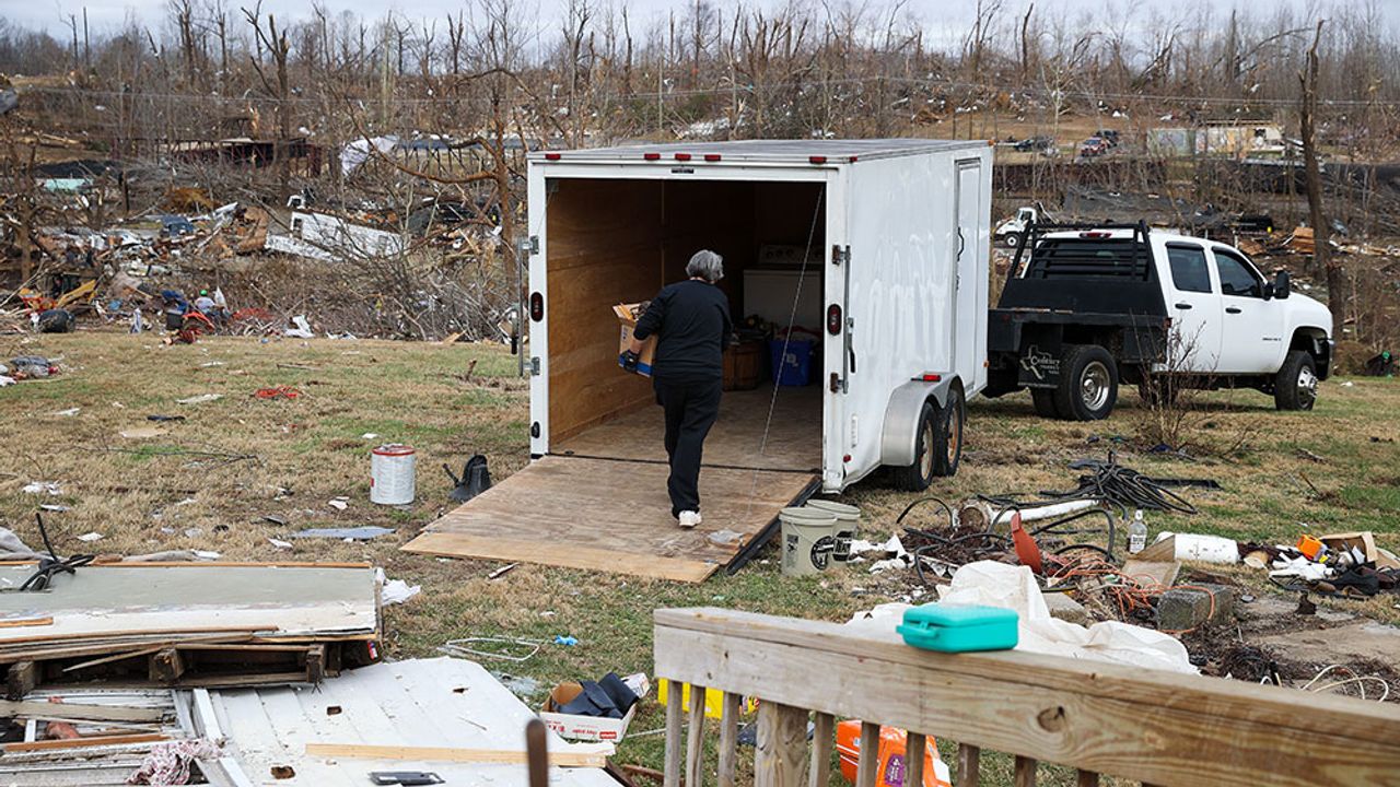 ABD'de hortumlar nedeniyle yerle bir olan Kentucky eyaletindeki Earlington kentinde çok sayıda ev zarar gördü. Evi yıkılan Bonnie Moxley enkaz arasında kullanılabilir durumdaki eşyalarını topladı.