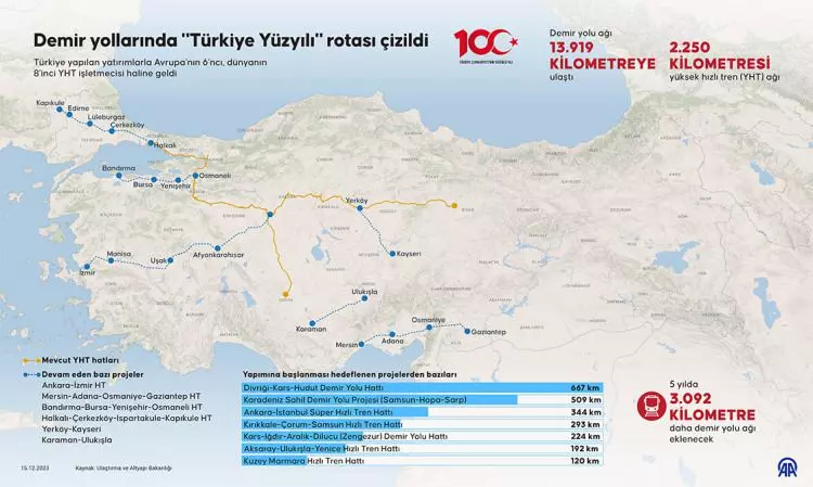 2002'de yaklaşık 11 bin kilometre olan demir yolu ağına, bu yıl itibarıyla 2 bin 250 kilometresi yüksek hızlı (YHT) ve hızlı tren (HT) olmak üzere, yaklaşık 3 bin kilometrelik hat eklendi. Türkiye'nin demir yolu ağı 13 bin 919 kilometreye ulaştı.