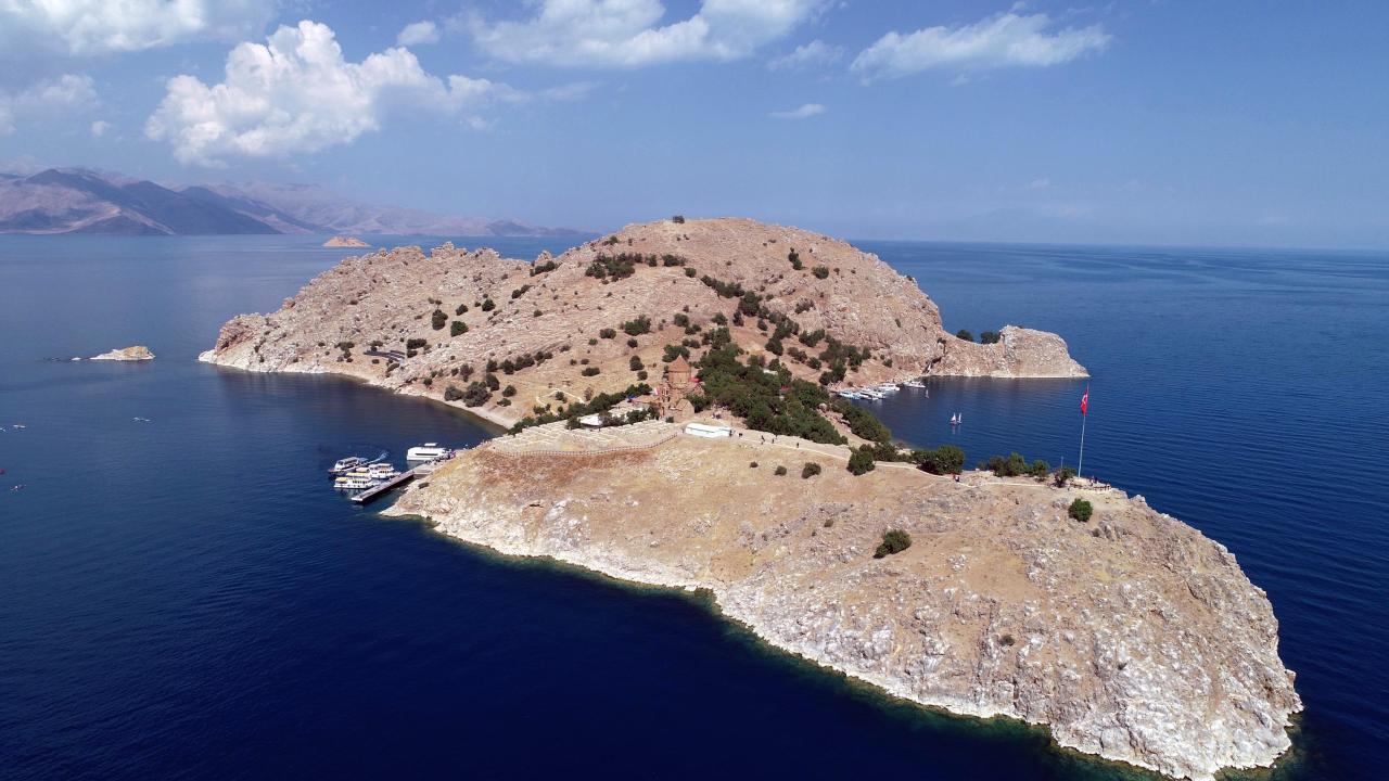 Van Gölü`nün ortasındaki ada ve üzerindeki kiliseyi görmeye gelen turistler, Edremit ve Gevaş ilçelerindeki iskelelerden kalkan teknelerle yarım saatlik yolculuğun ardından adaya ulaşıyor.
