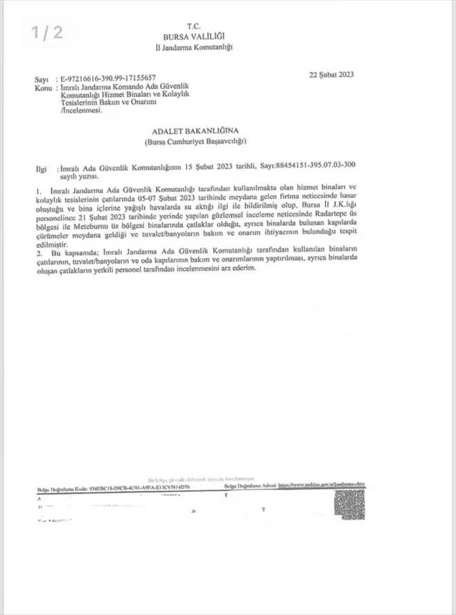 Açıklamada İmralı Jandarma Ada Güvenlik Komutanlığınca kullanılan hizmet binaları ve kolaylık tesislerinin çatılarında 5-7 Şubat tarihlerinde meydana gelen fırtına nedeniyle hasar oluştuğu ve bina içlerine su aktığı belirtildi.