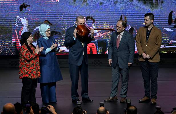 TRT Genel Müdürü Mehmet Zahid Sobacı, Emine Erdoğan'a Aybüke Yalçın'ın simge fotoğrafında kullandığı sembolik kırmızı yazmayı ve minyatür bağlamayı takdim etti.