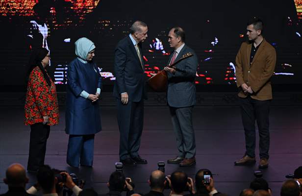 Filmin sonunda sahneye çıkan Cumhurbaşkanı Erdoğan'a, şehit öğretmenin ailesi tarafından Aybüke Yalçın'ın kullandığı bağlama hediye edildi.