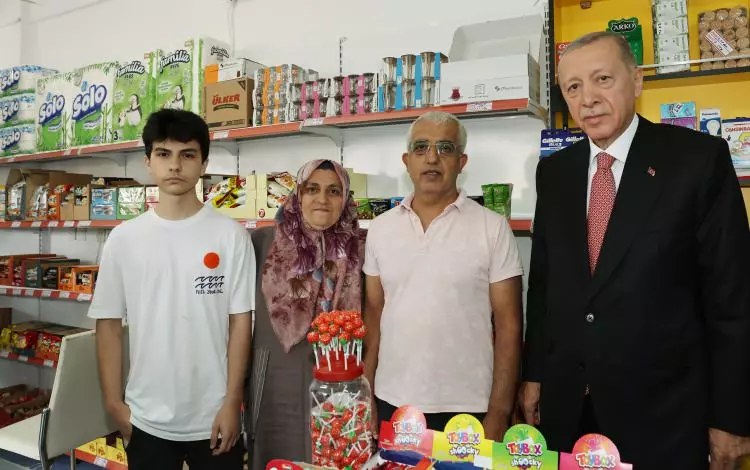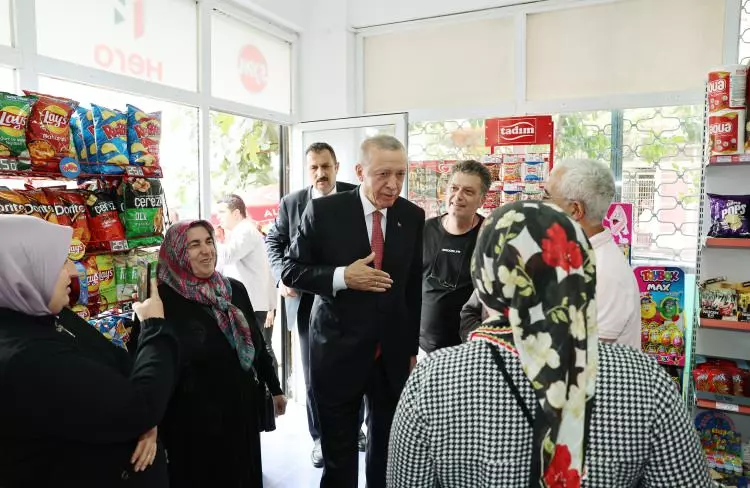 Güzergahta sık sık duran Erdoğan, bir mahalle bakkalında vatandaşlarla sohbet ederken sorunlarını dinledi, fotoğraf çektirdi.