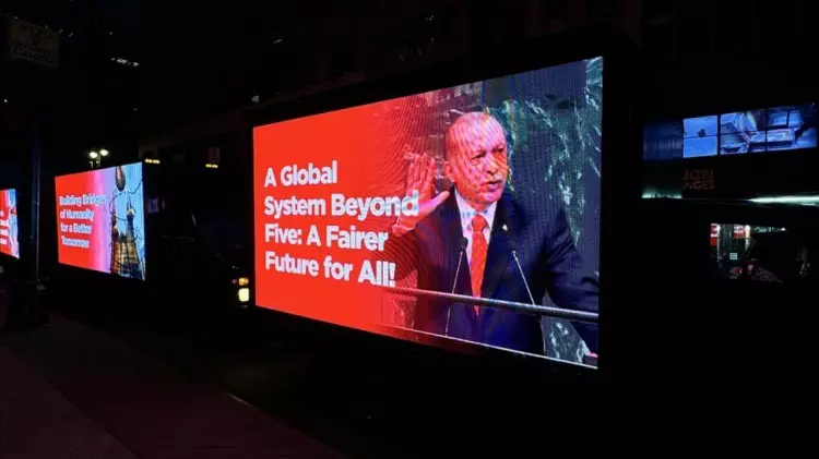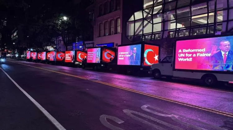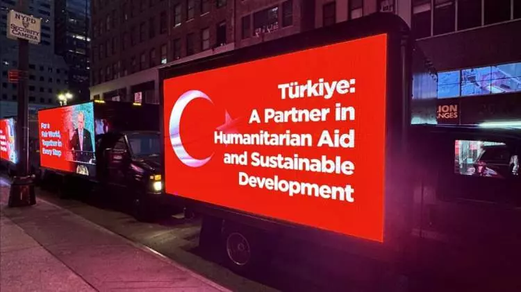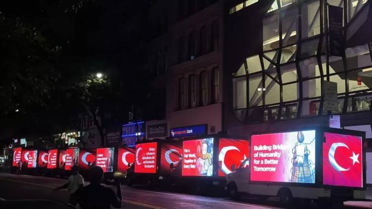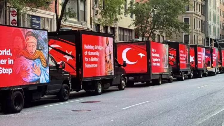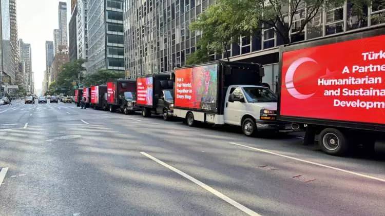 Times Meydanı gibi şehrin en kalabalık ve önemli noktalarında yan panellerinde “Dünya Beşten Büyüktür”, ``Türkiye: İnsani Yardım Ve Sürdürülebilir Kalkınmanın Adresi``, ``Adil Bir Dünya İçin Reforme Edilmiş Birleşmiş Milletler `` şeklinde İngilizce ifadelerin yer aldığı dijital ekranlı kamyonetler dolaştırıldı.