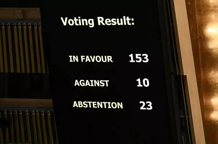 Ateşkese çekimser oy kullanan 23 ülke arasında yer alan Arjantin, Bulgaristan, Cabo Verde, Kamerun, Ekvator Ginesi, Gürcistan, Almanya, Macaristan, İtalya, Litvanya, Malavi, Marshall Adaları, Hollanda, Palau, Panama, Romanya, Slovakya, Güney Sudan, Togo, Tonga, Ukrayna, ve Uruguay oldu.