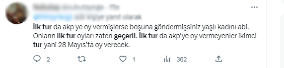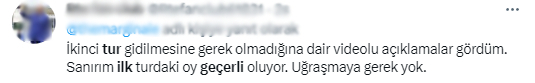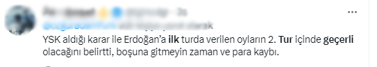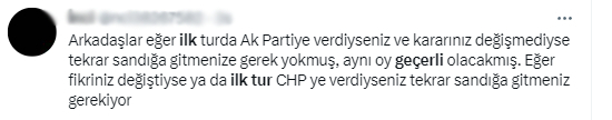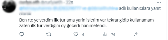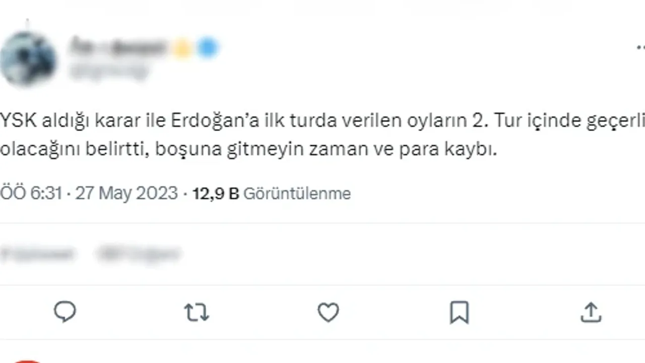Seçimlerin sabah 08.00'de başlamasının ardından Cumhurbaşkanı Erdoğan seçmenlerini yanıltmak isteyen muhalefet yandaşları sosyal medyada bir takım yalan paylaşımlar yapmaya başladı. Cumhurbaşkanı Erdoğan'a 14 Mayıs seçimlerinde oy veren vatandaşları aldatmak ve sandığa gitmelerini engellemek için başlatılan çalışmada, "İlk turda verdiğin oy hala geçerli, sandığa gitme kararını değiştirme" şeklinde paylaşımlar yapıldı.