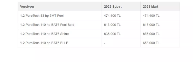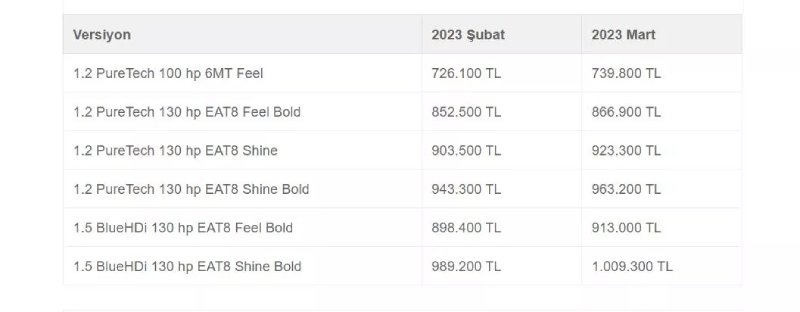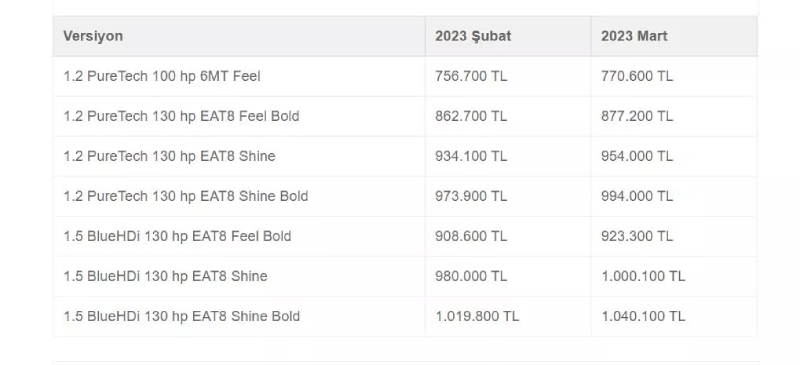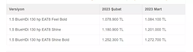 Citroen C5 Aircross'un da 2023 model yılı versiyonları Şubat ayında 1.078.900 TL'den başlıyordu. Mart ayında gelen zamla birlikte ilk basamak 1.084.100 TL'ye yükseldi. C5 Aircross bu fiyatlarla engelliler için ÖTV muafiyetli araç alım kriterlerine uymuyor.