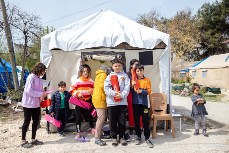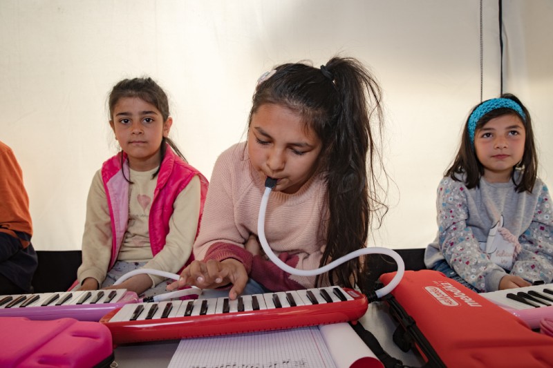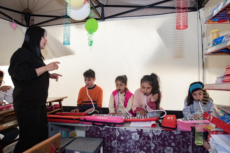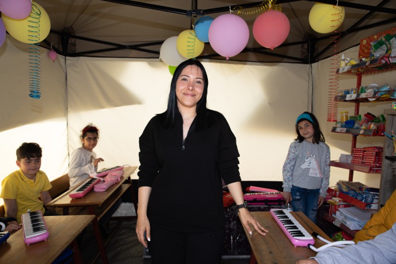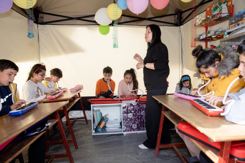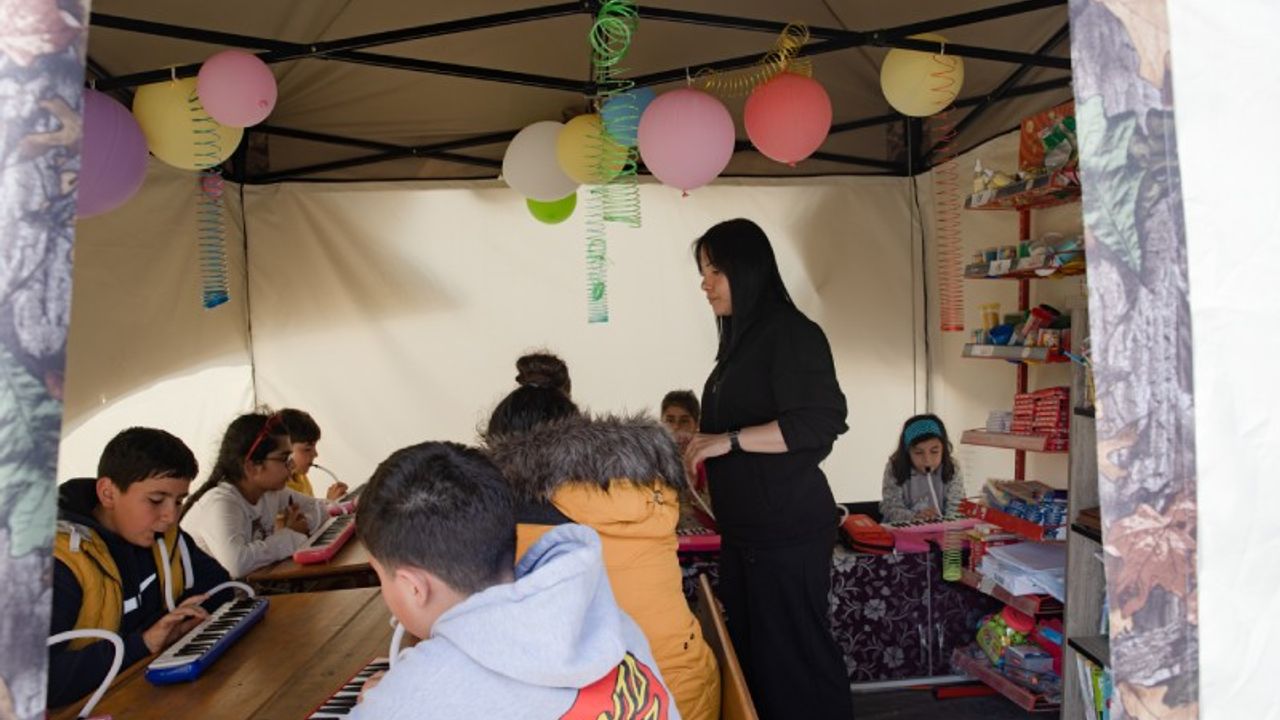 Kahramanmaraş merkezli depremlerin büyük yıkıma neden olduğu Hatay'ın Defne ilçesinde çadır sınıf kuran gönüllü öğretmenler, müzik ve resim dersleriyle çocukları afetin etkilerinden uzaklaştırmaya çalışıyor. Müzik öğretmeni olan Ezgi Ataş, depremzede çocuklara melodika dersi veriyor.