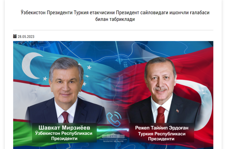 Özbekistan Cumhurbaşkanlığı sitesinde, "Özbekistan Cumhurbaşkanı Shavkat Mirziyoyev, Türkiye Cumhuriyeti Cumhurbaşkanı Recep Tayyip Erdoğan'ı bugünkü cumhurbaşkanlığı seçimlerindeki güvenilir ve tarihi zaferinden dolayı içtenlikle tebrik etti" ifadesi kullanıldı.