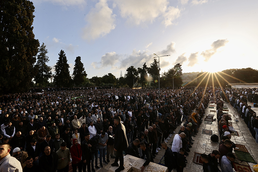 Mescid-i Aksa'nın bulunduğu Eski Şehir bölgesi bayram namazı nedeniyle yaya ve araç trafiğine sahne oldu. Cemaat, Aksa'nın kapılarında oluşan izdiham sırasında tekbirler ve salavatlar getirerek dualar etti.Kudüs İslami Vakıflar İdaresi'nden yapılan yazılı açıklamaya göre, yaklaşık 120 bin kişi bayram namazını Mescid-i Aksa'da kıldı.Namazın kılınmasının ardından tekbirler eşliğinde bayramlaşma kısmına geçildi. Cemaate bayramlıklarını giyerek katılan çocuklar dikkati çekti.