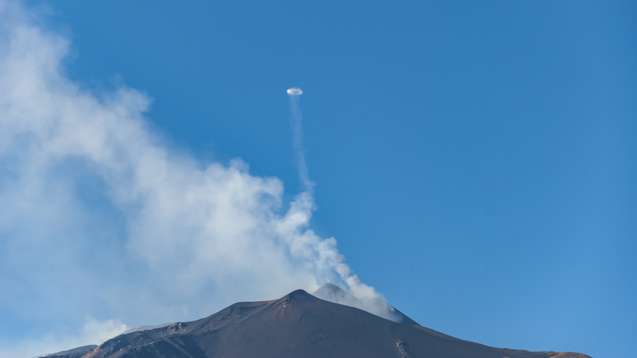 İtalya'nın güneyindeki Etna Yanardağı'nda volkanik faaliyet kaydedildi. 3 bin 326 metre yüksekliğindeki yanardağın "Vortex ring" olarak adlandırılan halka şeklinde duman püskürttüğü görüldü.