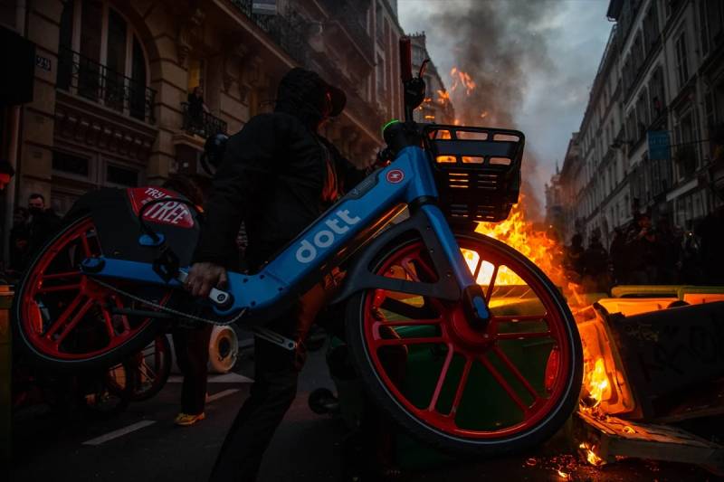 Protestolar sırasında bir gösterici belediye binası önünde bisikletini yaktı.