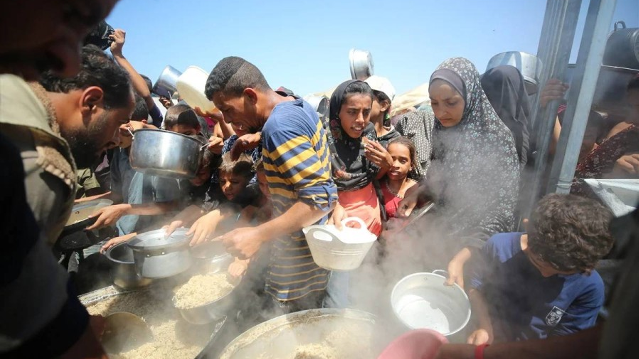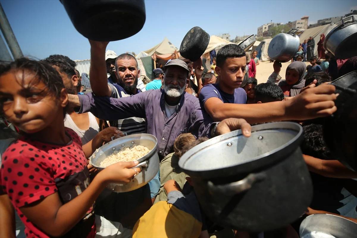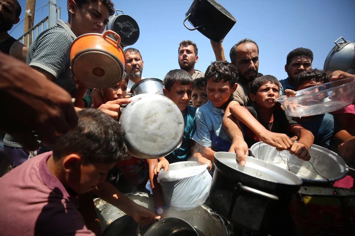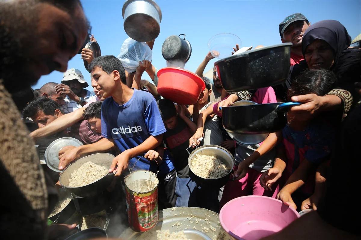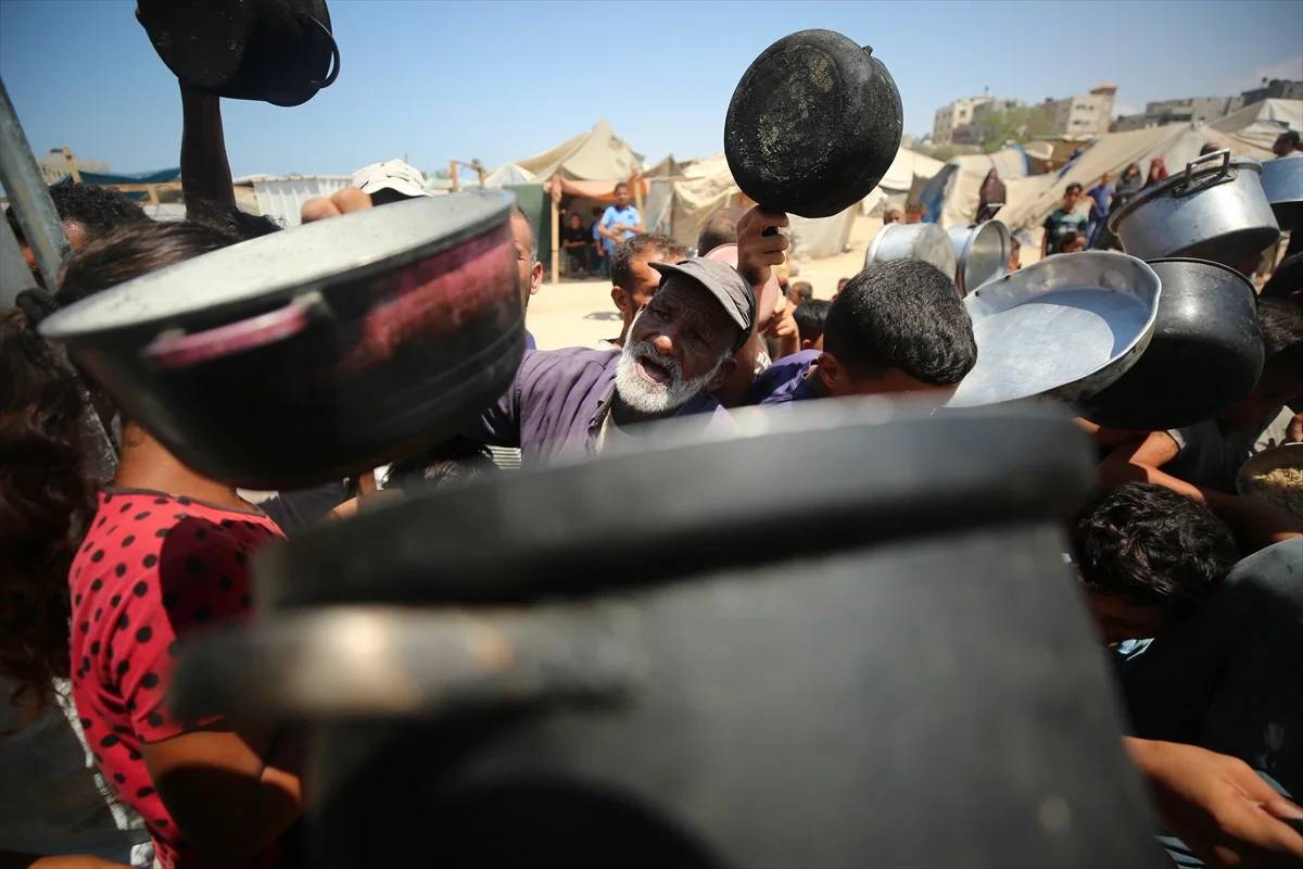 Hem açlık hem susuzluk hem de tıbbi malzeme eksiliği nedeniyle zorlanan Filistinliler, yemek dağıtımında uzun sıralar oluşturdu.