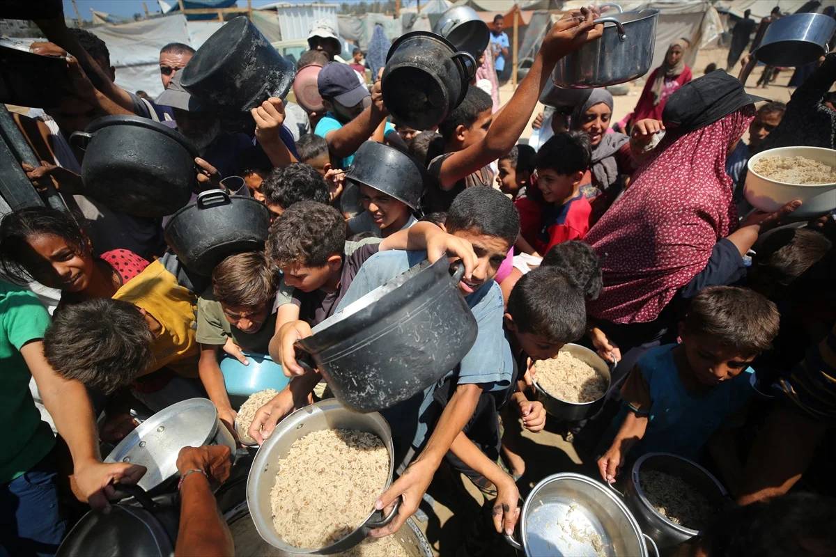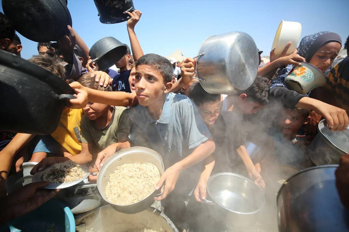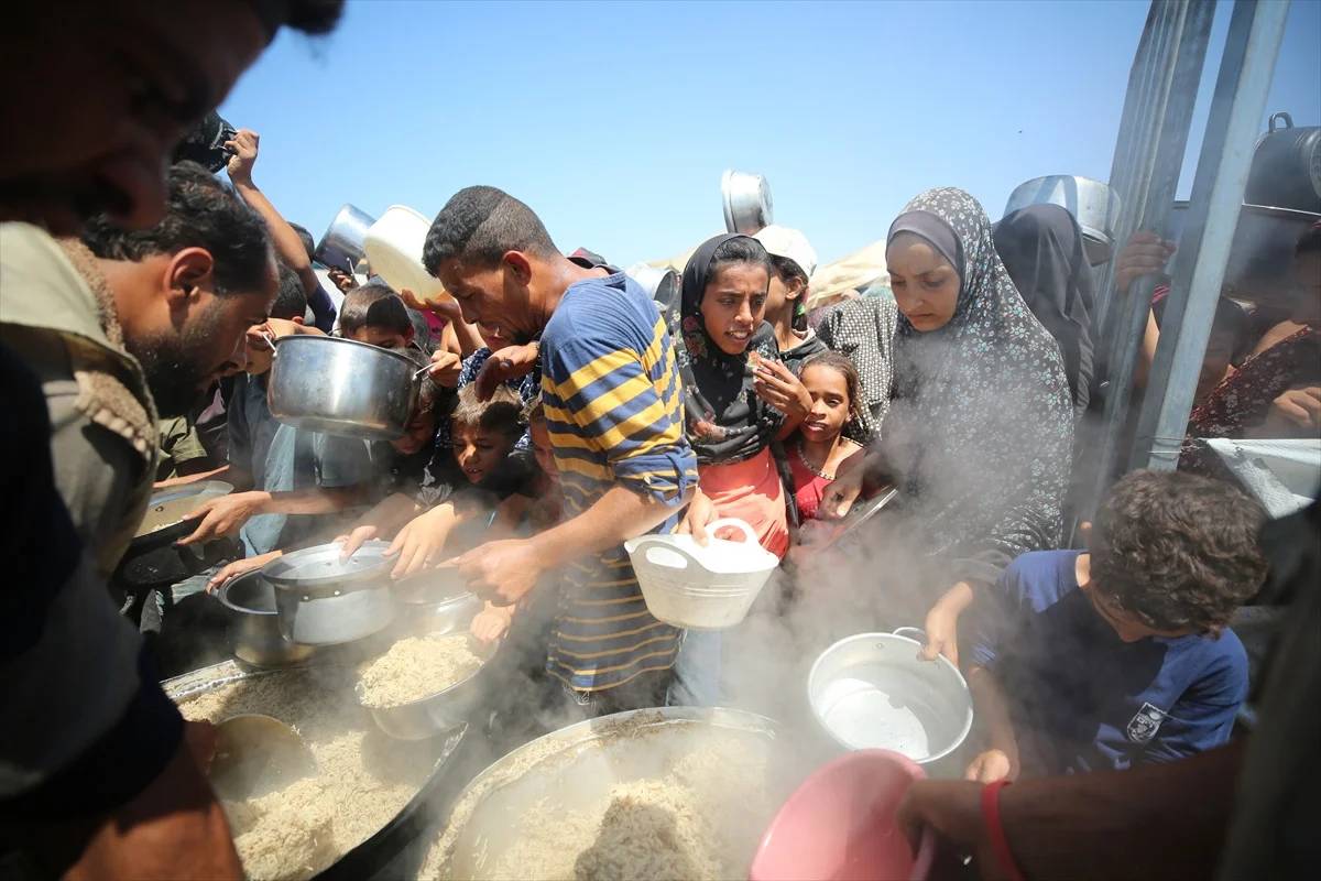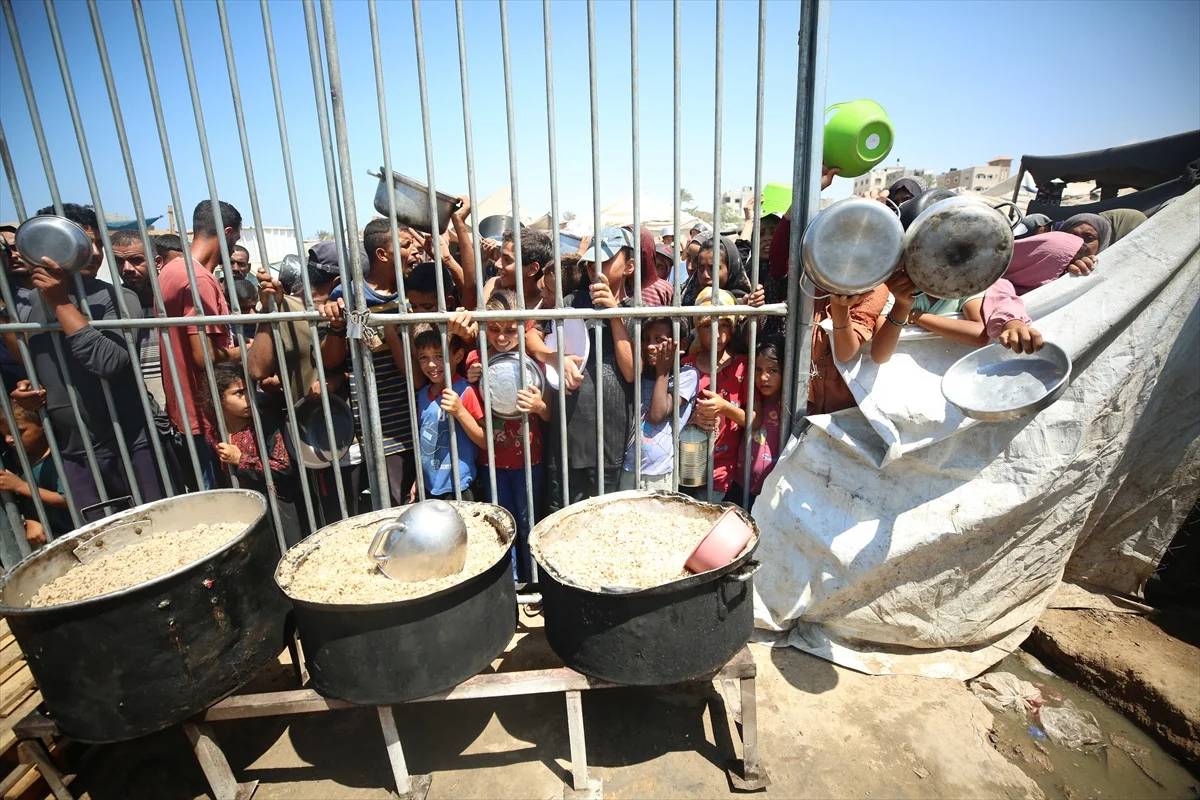İsrail ordusunun Gazze Şeridi'ne yönelik aylardır süren saldırıları nedeniyle Gazze Şeridi'nin Deyr Belah kentine bağlı Zawaida bölgesine sığınan Filistinlilere, hayır kurumları tarafından sıcak yemek dağıtıldı. Gazzeliler, dağıtılan yemekten alabilmek için sıra bekledi.