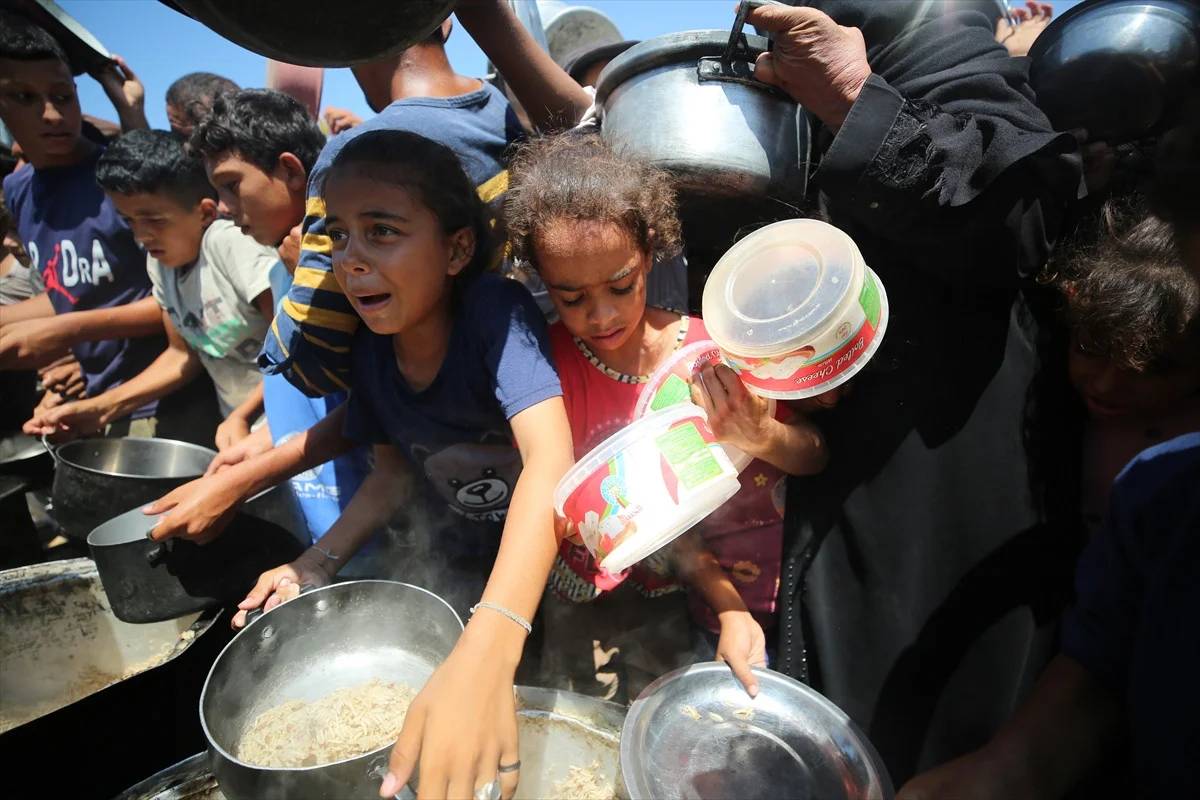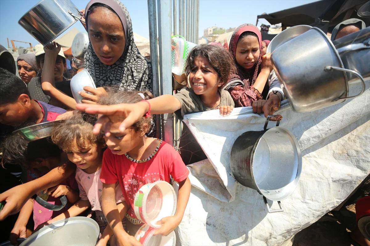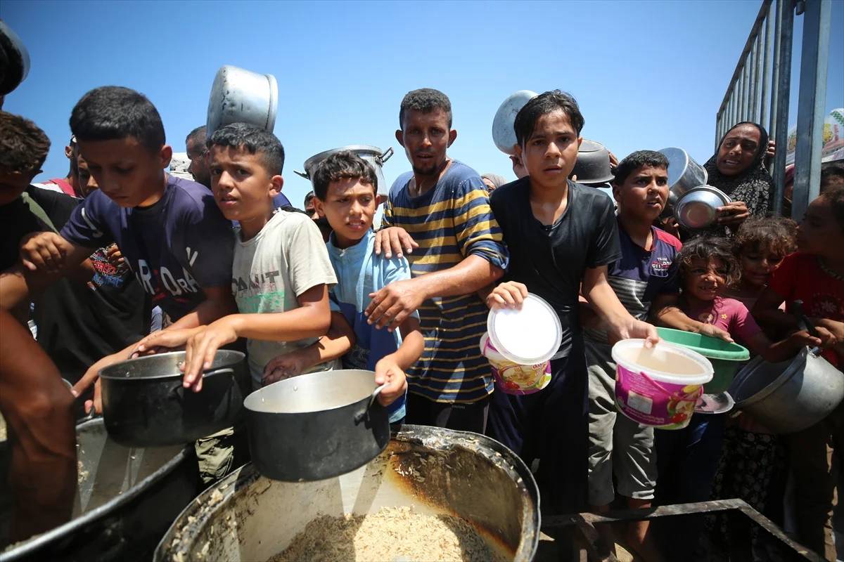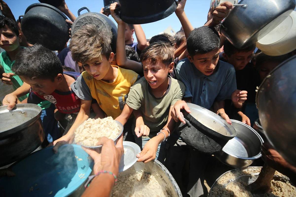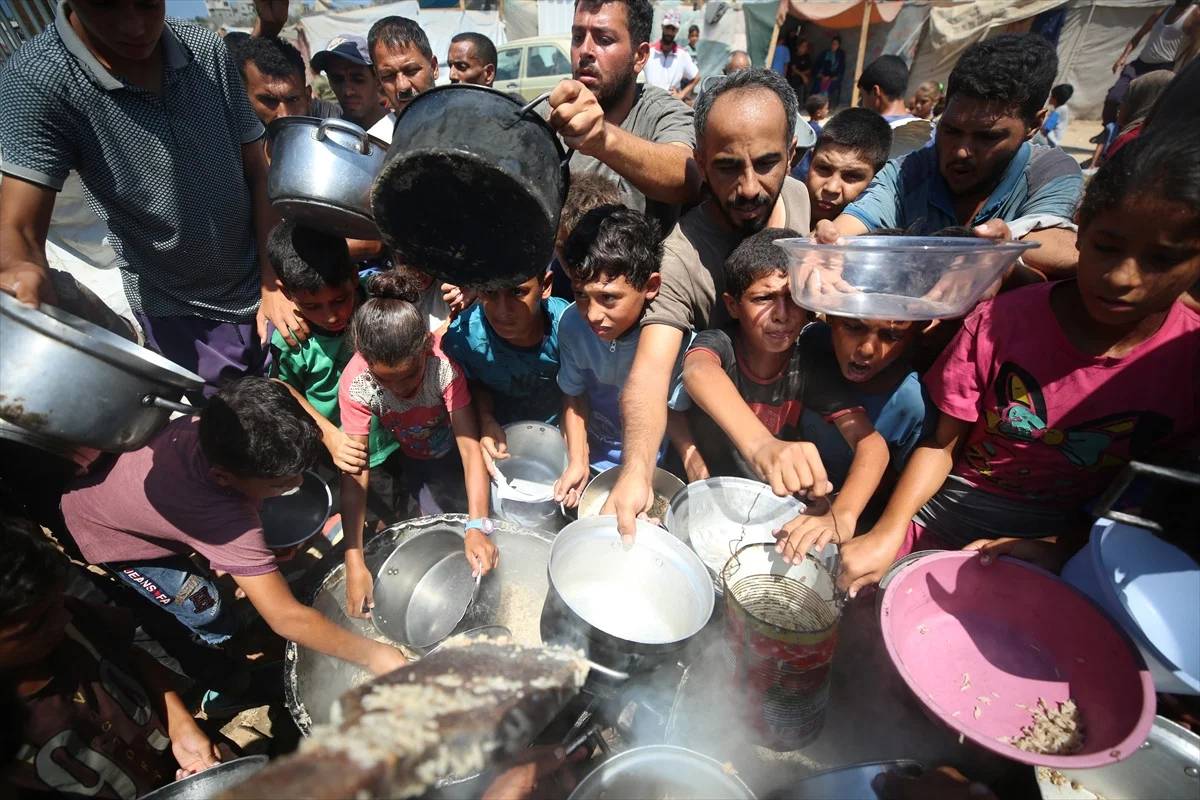 İsrail ordusunun Gazze Şeridi'ne yönelik aylardır süren saldırıları nedeniyle Gazze Şeridi'nin Deyr Belah kentine bağlı Zawaida bölgesine sığınan Filistinlilere, hayır kurumları tarafından sıcak yemek dağıtıldı. Gazzeliler, dağıtılan yemekten alabilmek için sıra bekledi.