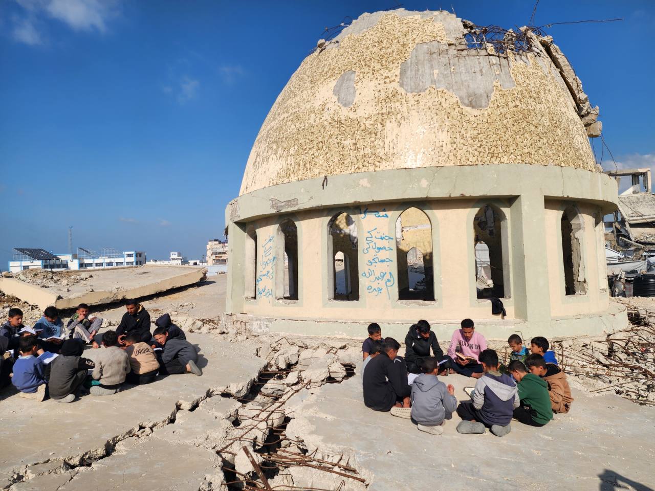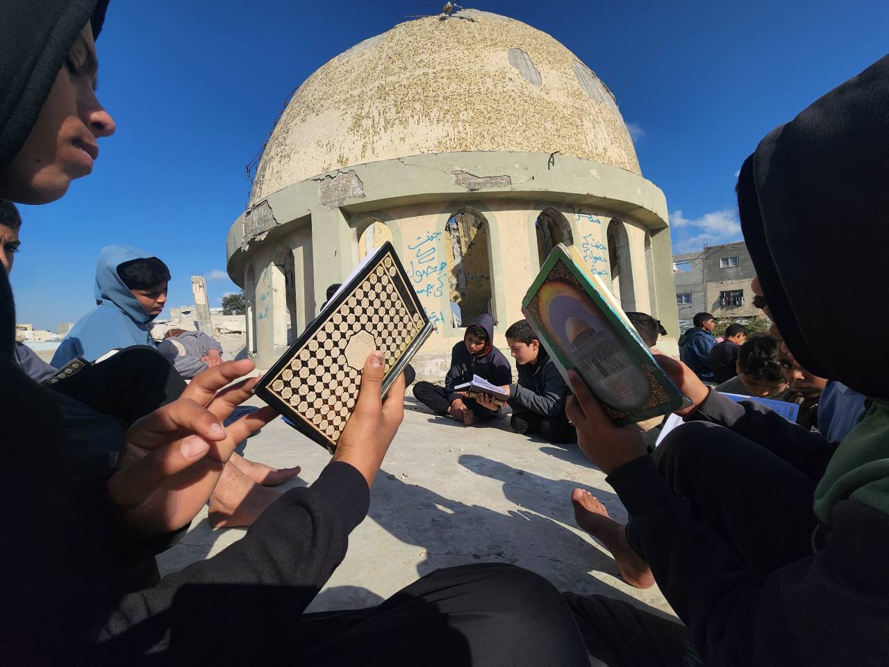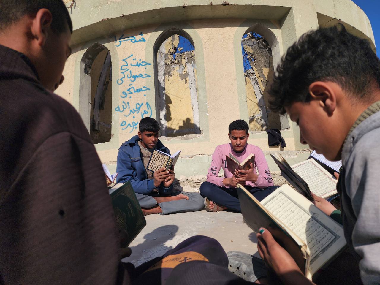 Gazze Şeridi'nin Han Yunus kentinde yaşayan Filistinli çocuklar, ramazan ayında iftar saatini beklerken günlerini, İsrail saldırısında ağır yıkıma uğrayan El Habib Muhammed Camii enkazında Kuran-ı Kerim okuyarak geçiriyor.